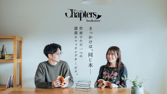 チャプターズは、選書 × マッチングを軸とした月額制のオンライン書店。恋する書店をテーマに、ユーザーは毎月選書を通じて本と出会い、同じ季節に同じ本を読んだ人とオンラインでも出会えるユニークなサービスです。登録者は延べ7,000人を超え、主に2-30代の独身男女より支持を受けて運営中です。