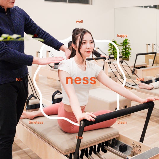 『ness pilates』のコンセプト「ness pilates」が大切にしている“ness”は、一人ひとりの人生を豊かにする「状態」や「価値観」を意味します。フィットネス(体を動かす楽しさ)、ウェルネス(心と体の健康)、ハピネス(喜び)など、多様な“ness”を見つけ、その実現を全力でサポートします。ピラティスは単なる運動ではなく、姿勢改善や体幹強化を通じ、体と向き合うことで新たな気づきや喜びを得られるメソッドです。心と体の両方を整え、動く時間を特別なものに変えることで、より豊かで自由なしなやかな人生を目指します。それが「ness pilates」の願いです。