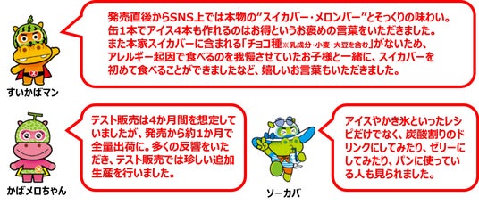 好評をいただいたポイントは、「家でアイスを作る意外性」「1缶でアイス4本も作れるコスパの良さ」「本家スイカバーとそっくりな味の再現性」です。今までになかった手作り用のスイカバーシロップの登場により、「幼稚園、保育園で手作りアイスを作ってみたい」 「ドデカいスイカバーを作りたい」「親子で一緒にアイスを作りたい」など、SNSや当社へのメッセージでたくさんの反響をいただきました。コストパフォーマンスも良く、食べてみると味も本家スイカバーにそっくりだというお声もいただき、瞬く間に人気商品になりました。