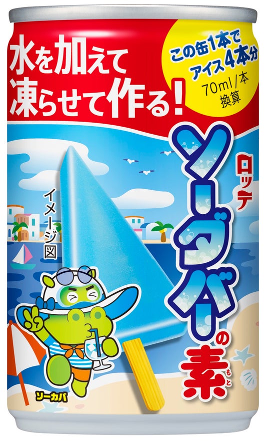 「スイカバー」「メロンバー」に続く味として、氷菓市場で最も人気があり定番の「ソーダバー」の開発を行いました。実は店頭で販売しているサイダーをそのまま凍らせても、炭酸の泡の影響でアイスが膨張してしまい綺麗なアイスバーは作れません。また味も薄いソーダ味になってしまいます。「ソーダバーの素」は水で希釈し、凍らせるとベストな味わいになるよう試行錯誤を重ねた濃縮タイプのソーダアイスのシロップになります。当社の販売するアイスにはない「ソーダバー」の新キャラクターとして「ソーカバ」も新登場。スイカバーのキャラクター「すいかばマン」のお友達として本商品を盛り上げます。