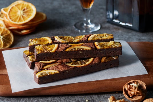 バレンシアオレンジとトリプルセック(オレンジリキュール)を生地に練り込んだ、濃厚なチョコレートに爽やかな柑橘が香る生ブラウニー。見た目も鮮やかに仕立てました。