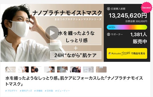 本プロジェクトは、Makuakeで13,245,620円を集めた有限会社ジーンスレッド(https://www.genethread.net)の超人気マスクを使用した新商品です。4月29日のクラウドファンディング終了までに、さらなる支援獲得が見込まれています。