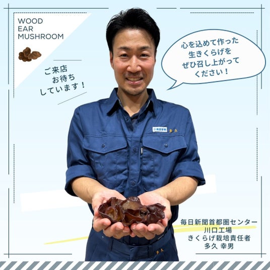 TONICHIのグループ企業 株式会社毎日新聞首都圏センター(本社:埼玉県川口市、社長:渡邊 雅春)は、2月よりきくらげ栽培に新規参入し、本社工場内に最大5600個の菌床を収納できる最新鋭のきくらげ栽培庫を建設して栽培を始めました。今回、フェアで提供するのは、無農薬で育てられた希少価値の高い初収穫の国内産生きくらげです。