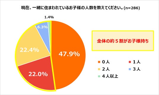 また、お子様の同居人数について伺ったところ、最も多かったのは「0人」(47.9%)、次いで「2人」(22.4%)、「1人」(22.0%)という結果になりました。全体の約半数の方がお子様と生活していることが分かりました。