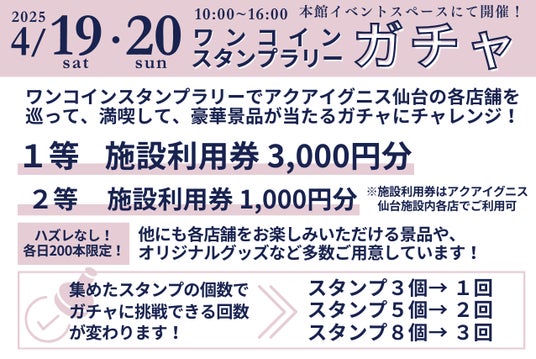 ワンコインスタンプラリーで集めたスタンプ数に応じて、施設利用券3,000円分など豪華景品が当たるガチャに挑戦できます。