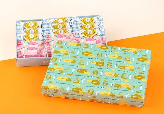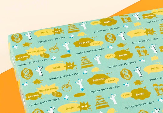 大阪のシンボルと言える“大阪城”をイメージした緑のカラーリングに、たこ焼きや漫才など大阪らしいモチーフを散りばめた『大阪限定パッケージ』。「ええやん」「なんでやねん」「まいど」と関西弁も交えて、遊び心あるパッケージデザインで登場します。手土産にすれば盛り上がること間違いなしの、にぎやかな雰囲気に仕上がりました。シュガーバターの木の本拠地、東京では手に入らないレアな一品。大阪みやげはもちろん、日本みやげにもどうぞ!