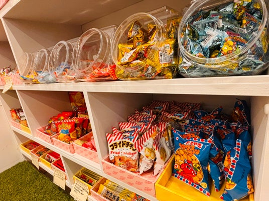 【食べ放題の駄菓子】:店内には70種類以上の駄菓子がずらりとならび、自由に手に取って楽しめます。ラインナップは随時更新されるのでそれが再入店の楽しみにもなります。
