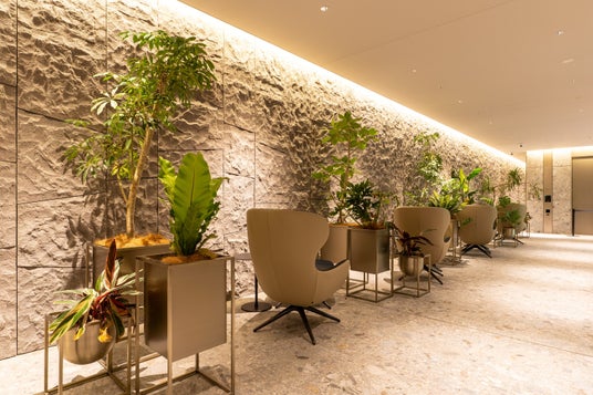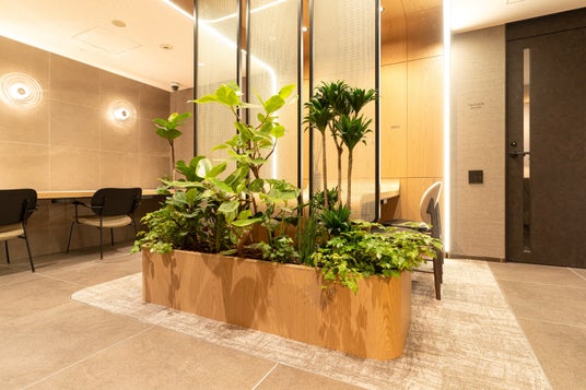 憩いの場となるラウンジには本物のグリーンを用い、照度が低い空間はアートグリーンを使うことでグリーンによる癒しを損なわない空間演出をしています。