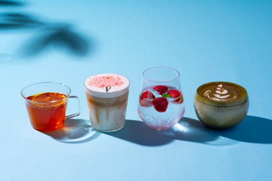 (左から)スプリングシトラスティー、桜ラテ、ストロベリーレモンソーダ、チョコレート抹茶ラテ