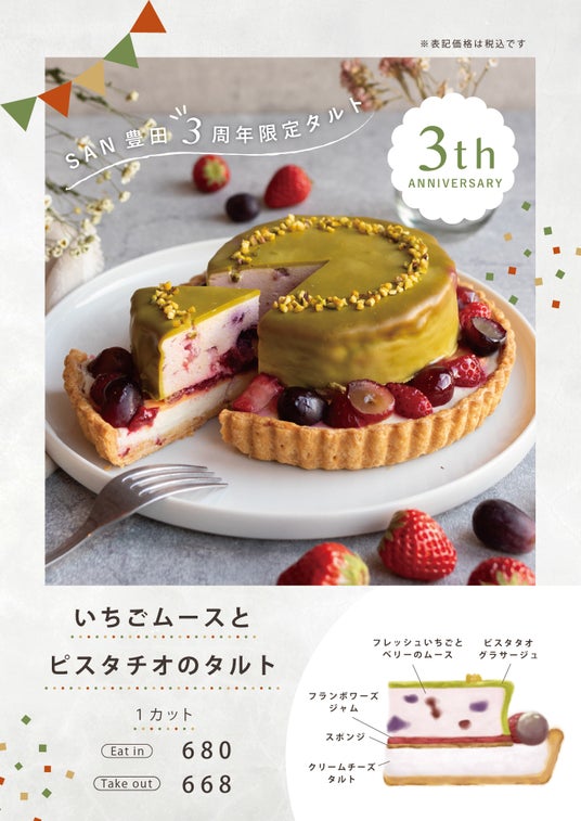ベリーのたっぷり入ったフレッシュいちごムースにピスタチオの香ばしさが漂うコーティングを施したSAN豊田3周年限定タルト。甘さと酸味、そしてナッツの風味が絶妙に調和した一品です