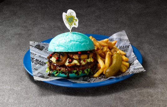 また、三大魔法学校対抗試合の出場校、ダームストラングとボーバトンをイメージしたプレミアムバーガーがメニューに仲間入り。厳格なダームストラングをモチーフにしたのは、真っ赤なバンズにジューシーなフィリングを挟み、スモーキーソースとガーリックチリソースで仕上げたパンチの効いたバーガー。スモークしたパプリカパウダーをまぶしたチップスと一緒にお楽しみください。一方、ボーバトンをイメージしたバーガーは、鮮やかなローブの色を再現したブルーのバンズに、フォアグラのような濃厚な味わいの鶏レバーのパティをワインの風味でリッチな味わいに。フランスの代表的な料理「ロッシーニ」をイメージした高級感ある味わいをトリュフ塩のチップスと共にお召し上がりいただけます。