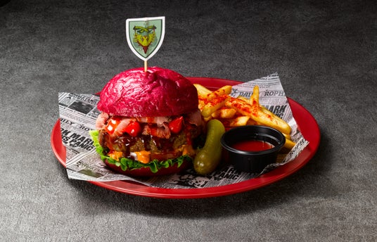 三大魔法学校対抗試合の代表のひとつであるダームストラングをイメージしたプレミアムバーガー。ジューシーなフィリングと2種のソース(スモーキーソース・ガーリックチリソース)は相性抜群で暑い季節にピッタリ。