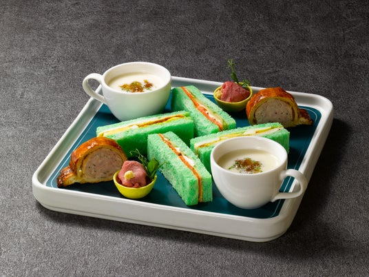 一段目のプレートには、優勝杯をモチーフにしたアイシングクッキーと、闇の帝王ヴォルデモートの復活のシーンから着想を得た「復活の大鍋シュー」が、二段目には、第一の課題でハリーがドラゴンのハンガリー・ホーンテールと戦った岩場をメレンゲで再現し、マンゴーとパッションフルーツのムースを添えた「ロッキー ケーキ」、そして第二の課題解決のヒントを得た監督生の風呂場をイメージした色鮮やかなベリーヌをラインナップ。そして、マルフォイがハリーに言い放った名セリフ「汚いぞ、ポッター!(Potter stinks!)」を記したバッチ型のチョコレートも登場します。三段目には、第三の課題の迷路を表現したサンドウィッチなど、3つのプレートを舞台に物語が展開されます。また、アフタヌーンディーをご注文いただいたお客様全員に、4種のドラゴンのアイシングクッキーがランダムに当たる特典をご用意。三大魔法学校対抗試合の代表選手たちが対決するドラゴンを引くシーンさながら、巾着の中に入った4種のアイシングクッキーを選んでいただくことができます。ハリーたち出場選手のドキドキ感とともに味わえる、特別企画だけのメニューをお楽しみください。