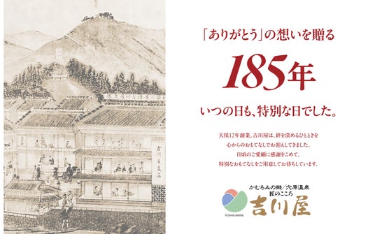 創業185周年を迎える今年、「匠のこころ 吉川屋」では、皆さまへの日頃の感謝を込めて、特別室や貴賓室の宿泊券が当たる抽選会やエピソードコンテストなど年間を通して実施致します。