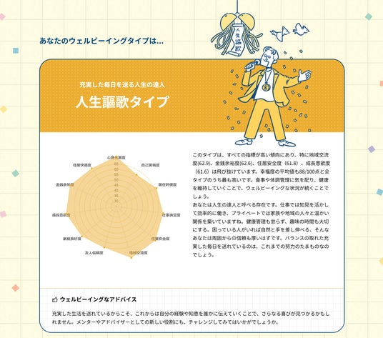 さらに自分の特徴やウェルビーイングに暮らすアドバイスを、生成AIが回答者ひとりひとり個別に