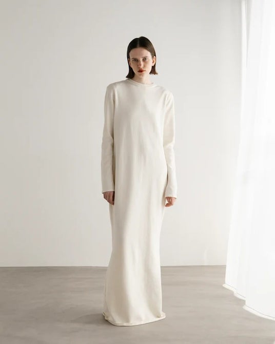 ストレートショルダーがポイントのロングスリーブニットマキシドレス。足元にたっぷりとたまる着丈と、手の甲までかかるくらい長くととった袖丈が特徴です。