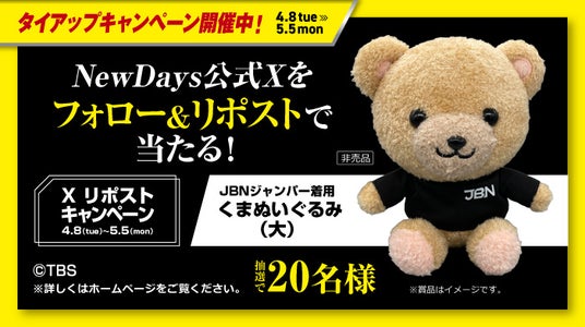 NewDays公式X(@newdays_jp)をフォローし、4月8日投稿の対象のポストをリポストしていただくと、抽選で20名さまに「JBNジャンパー着用くまぬいぐるみ(大)(非売品)」をプレゼントいたします。詳しくはNewDays公式Xをご確認ください。