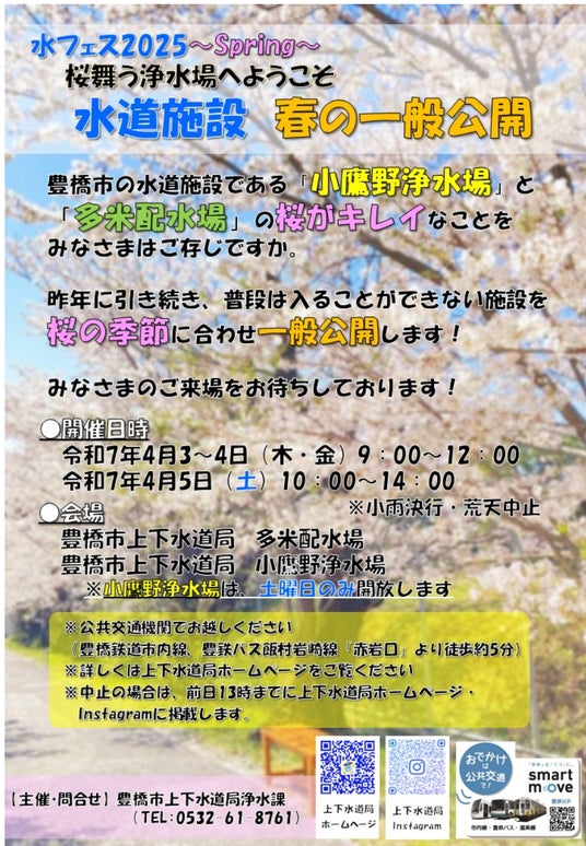 愛知県豊橋市は今年も、桜の咲く季節に合わせ、水道施設を一般公開します。小鷹野浄水場(同市東小鷹野2丁目9の3)と、すぐ隣で桜並木のある多米配水場(同市多米町蝉川33の149)です。「水フェス2025―Spring―桜舞う浄水場へようこそ!」として、1部、2部の2回開催します。普段は入れない施設ですので、ぜひこの機会にお楽しみください!