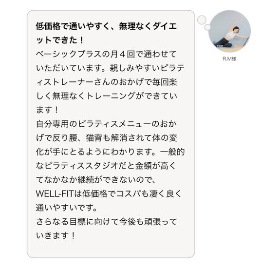 他のピラティスジムだとトレーニングだけだったので、プロに体のことを考えてもらいながら伸ばしてもらえるのがありがたいです