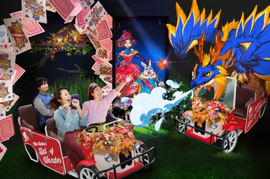 1865年に出版されたルイス・キャロルの名作「不思議の国のアリス」をオリジナルストーリーで楽しむライド系アトラクション「アリスツアーズ」はマッドハッターの帽子店「ハット オブ ワンダー」の専属ドライバーが運転する「英国式電動足漕ぎ4輪」に乗車し、森のパーティー会場へ向かうスリル満点のアトラクションです。本コンテンツはオープン3年目を迎える今春まで、シーズン毎に新キャラクターや新演出、新アクティビティーを導入し続ける、全国的にも珍しい「進化するアトラクション」で、この春も大きく2つの進化を遂げます。原作の中の見せ場の一つである「宙を舞うトランプ」さながらのアーチがサーカステント内に登場します。また、日本で唯一、ドラゴンにエサやり体験が出来るのも魅力の一つです。本アトラクションの人気者、ブルードラゴンが従来の咆哮に加え、大迫力の冷たく白い息、アイスブレスを吐く演出が追加されます。可愛らしくも迫力満点のドラゴンがゲストに向かって吹きかける息は臨場感たっぷりです。