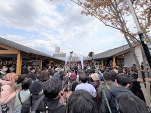 初日は商業施設前のヤマザクラが満開に。春らしい陽気の中、約3,000人(17:00現在)が広島城三の丸を訪れました。