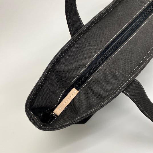 ボトルホルダーと上部ファスナーで本が濡れない工夫読書家の皆様の声をもとに、雨や雪から本を守り、防犯面でも安心な上部ファスナー を追加しました。ヌメ革の引き手が、さりげないアクセントになっています。