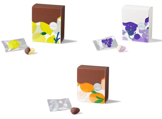 甘ずっぱくてジューシーな「ピュレグミ」に、こだわりのチョコレートをひとつひとつ丁寧にコーティングしました。「グレープ&ホワイト」はホワイトチョコレートを、「レモン&ビター」はビターチョコレートを半掛けにしています。「みかん&ビター」はビターチョコレートを全掛けし、中のグミはジュレ入りです。