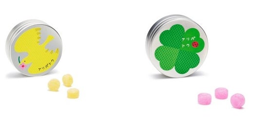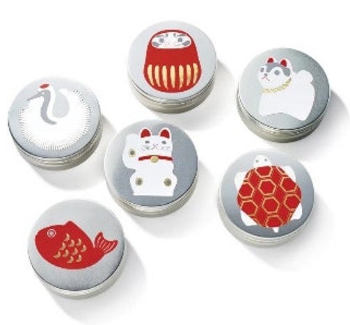 持っているだけで何かいいことがありそうな、縁起のいいキャンディシリーズ。缶には鯛や招きねこなど縁起の良い物をデザインしました。小粒のキャンディは紅白の色合いのアップル味(赤)とヨーグルト味(白)の2種入り。