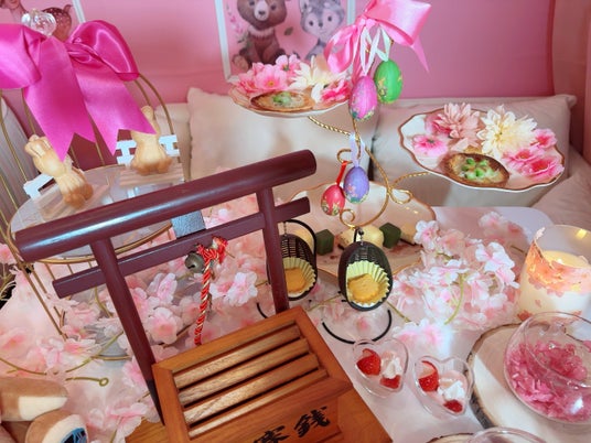 世界観たっぷりの“神社風”フォト空間ミニ鳥居やお賽銭箱、桜の装飾が満開!