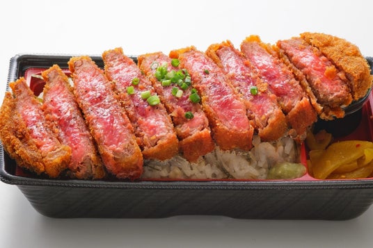 勝升自慢の「牛とろかつ」は、牛かつの美味しさを最大限に引き出す為、旨味たっぷりの牛脂を加えた勝升特製加工サーロインを使用しております。柔らかい肉質とサシの入った牛の旨味、そして歯切れの良い薄皮衣との一体感を存分に堪能でき、牛かつへの欲求がすべて満たされる究極の牛かつです。