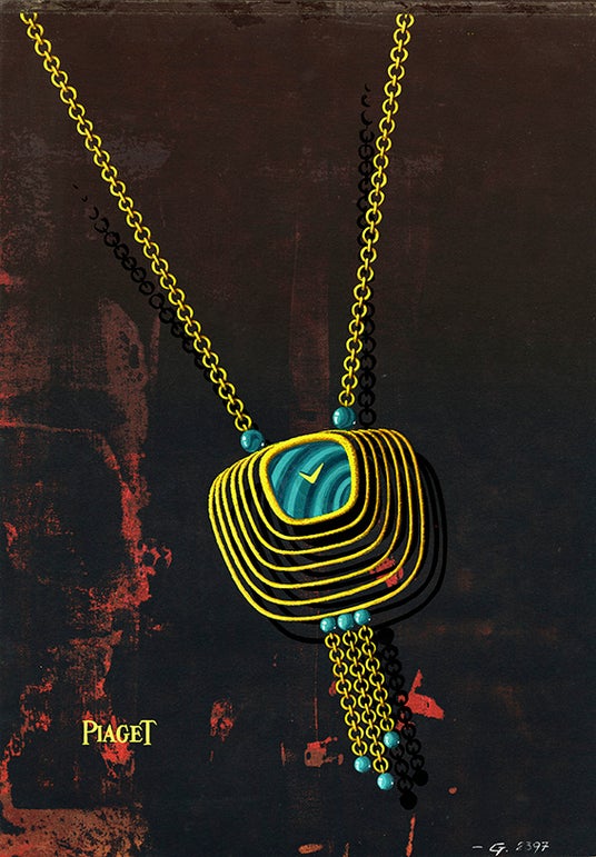 1969年はピアジェの歴史において重要な節目となり、メゾンのアイデンティティを再構築する創造的なルネッサンスの幕開けとなりました。ピアジェは、1957年の9Pムーブメントや1960年の12Pにより超薄型時計の分野で確固たる地位を築いていましたが、メゾンはスイスウォッチ製造の枠を超えた挑戦をしようとしていました。スイスのウォッチメーカーとしては前例のない試みとして、ピアジェは1960年代にデザイナーたちをパリのクチュールショーに送り込み、ファッションの世界に触れる機会を提供しました。インスピレーションを得てスイスに戻ったデザイナーたちは、それを革新的なデザインへと昇華させ、光沢のある雑誌のページに登場するモデルたちに直接ウォッチをスケッチしました。彼らのビジョンは、伝統的な腕時計の枠を超えるもので、時間をスタイルの一部として捉え、ネックレスやカフスとして身に着けられるように再構築しました。