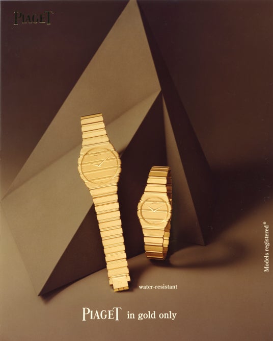 1979年 PIAGET POLO すべてを変えた名前1979年のPiaget Poloのデビューは、メゾンの歴史において重要な節目となりました。これ以前のピアジェの作品は、独自のスタイルによって明確に識別されていたため、名前で区別する必要はありませんでした。しかし、Piaget Poloはそれ以前の作品とは一線を画していました。大胆でアイコニックなデザインが独自の存在感を示し、ピアジェで初めてモデル名が付けられたウォッチとなりました。貴金属のみで作られたPiaget Poloは、同時代の他のモデルとは異なる存在感を放っていました。特徴的なゴドロン装飾(ポリッシュ仕上げとサテン仕上げを交互に施したライン)がケースからブレスレットまでシームレスに流れるデザインは瞬く間に認識されるようになりました。イエローゴールドモデルが最も広く知られていますが、ホワイトゴールドモデルも製作されており、現在ではそれを見つけることは難しくなっています。これは単にブレスレットを備えたウォッチではなく、視覚的に完璧な調和を成す独特のフォルムを持つ、完全に一体化されたウォッチブレスレットでした。