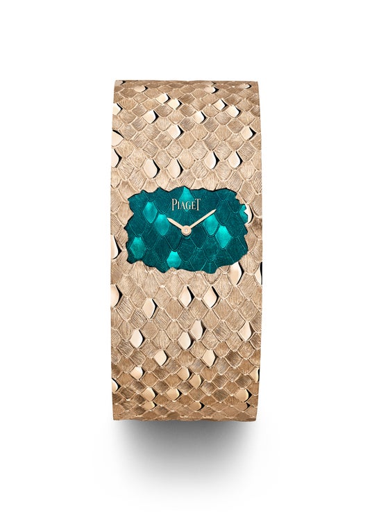 2025年、ピアジェはスウィンギング ソートワールと「Hidden Treasures」コレクションを拡大し、「21st Century」コレクションのスピリットを受け継いだ個性的な新作を展開します。メゾンのアイコニックな手編みチェーンにセットされたスウィンギング ソートワールには、色鮮やかなのストーン(ルビー、ターコイズ、タイガーズアイなど)の数々があしらわれました。また、ピアジェはカフ ウォッチの伝統を継承した、オパールの文字盤の一部を密やかに隠すような大胆なデザインの新作カフを発表しました。アシンメトリーなホワイトゴールド製ケースのテクスチャーは自然からインスピレーションを得たもので、波打つような模様は、風や水によって優しく彫刻されたかのようです。二つ目は、ピンクゴールドのスネークパターンにグリーンのエナメル文字盤をあしらったモデルです。スウィンギングソートワールのゴールドチェーンと同様に、「Hidden Treasures」もピアジェの熟練した金細工職人の手によって精巧に作り上げられ、代々受け継がれるメゾンの伝統が息づいています。「21st Century」コレクションは単なるタイムピースにとどまらない、メカニカルな卓越性を芸術的表現に昇華させるという哲学を体現するコレクションでした。どれも個性を讃え、ウォッチという機能を個々のスタイルへの表現へと変貌させました。ウォッチが芸術となったこの革新的なアプローチは、今もピアジェの象徴であり続けています。