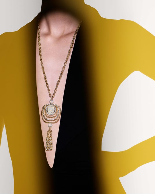 この創造的解放は、「21st Century」コレクションという革新的なコレクションで頂点を迎え、メゾンは技術の卓越性が芸術性を引き出し、ジュエリーとウォッチの関係性を一変させる新しいアプローチを示しました。ピアジェはスイスのマニュファクチュールにおける長い歴史の制約に縛られることなく、1960年代を象徴するアーティストやデザイナーたちのように、時代の活気あるエネルギーを若々しい精神で迎えました。このコレクションは、スイスウォッチ製造の伝統に敬意を払いつつも、従来の伝統に挑戦する大胆な感性を取り入れることで、深み、形、色彩の斬新な調和をもたらしました。アシンメトリーなトラペーズ型はピアジェのシグネチャーとなり、長いスウィンギング ソートワールに吊り下げられ、または精緻に作られたカフスに組み込まれ、オーナメンタル ストーンの文字盤がその鮮やかさを一層際立たせました。スウィンギング ソートワールとカフ ウォッチは、「21st Century」コレクションの最も象徴的な作品となりました。先見の明を持つデザイナー、ジャン・クロード・ゲイトによる指揮の下、これらのウォッチは単なるウォッチを超えた存在となり、時代を象徴するダイナミズムと自由な表現を体現する存在となりました。