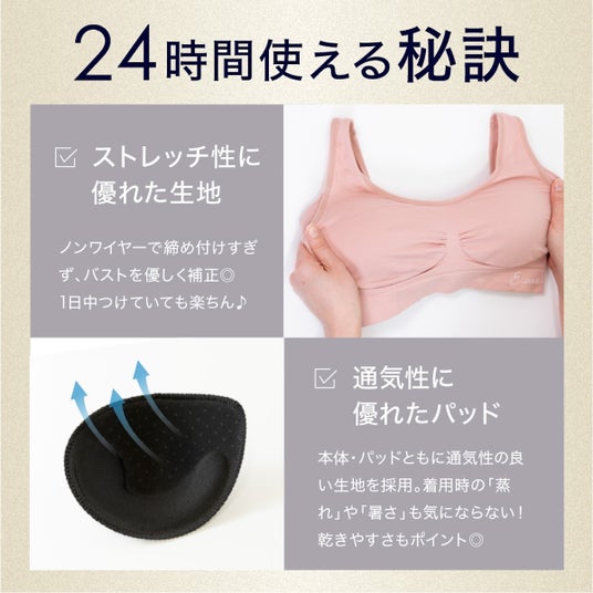 ノンワイヤーで締め付けすぎず、長時間つけてもラクちん。