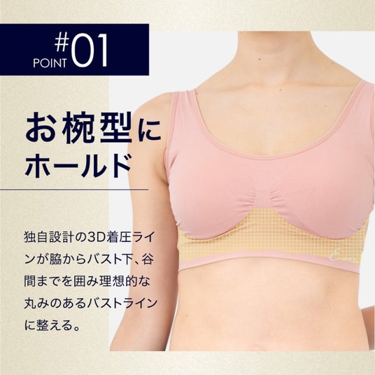 ノンワイヤーながらも独自の「3Dホールド構造」がバストをしっかり支え、美しいシルエットをキープします。