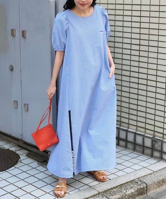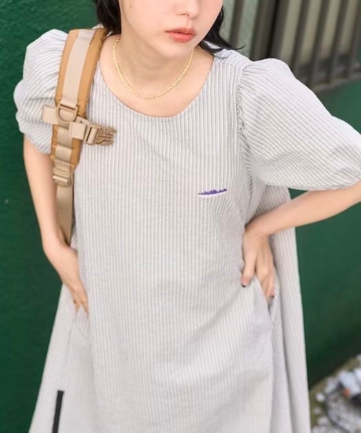 ITEM01 別注 シアサッカー ストライプ パフスリーブワンピース ¥17,545(tax in)