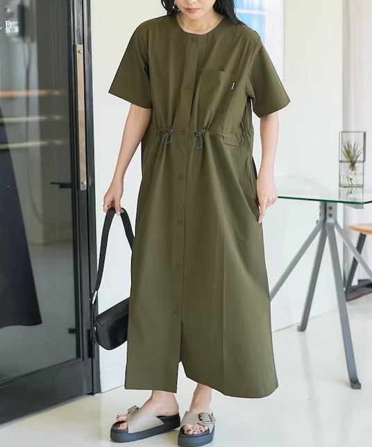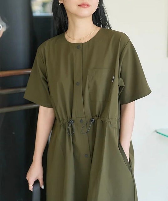 ウエストにはドローコードを備えメリハリのあるシルエットで、胸ポケットや広めのネックラインがデザインのポイント。