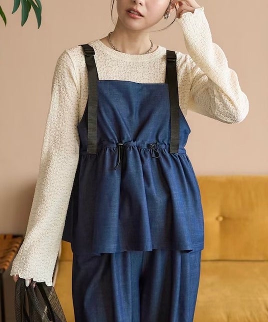 ベルトストラップとギャザー切替が特徴的なキャミソールで、絞り具合を調整し、より女性らしいシルエットに。