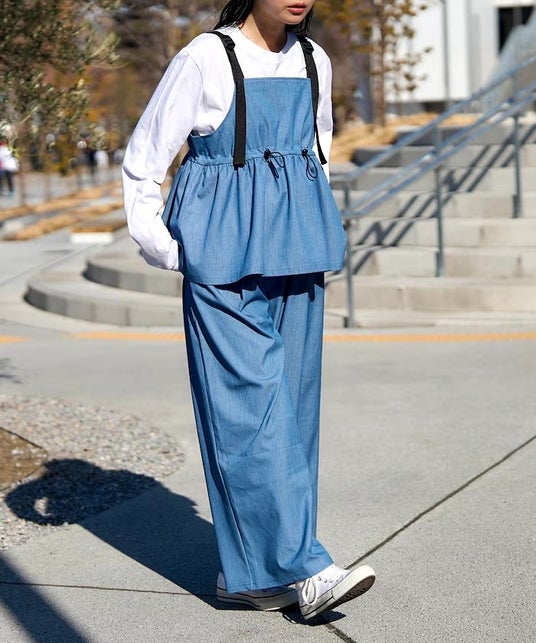パンツは程よいワイドシルエットで、タック入りのウエストゴム仕様で、リラクシーな履き心地。