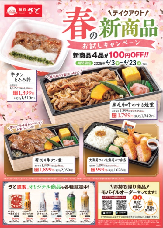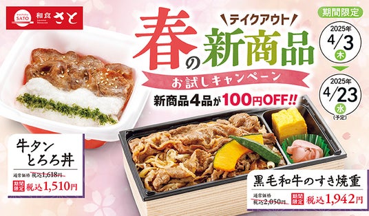 国内198店舗を展開する「和食さと」では、「春の新商品お試しキャンペーン」と題して、テイクアウトの新作&リニューアルメニューの4品を【108円OFF】で販売する特別キャンペーンを4月3日(木)より開催します。今回のキャンペーンでは4月3日(木)からリニューアルするテイクアウトメニューの中で、新メニューやおすすめのメニューをお得な価格で販売します。期間限定販売の際、大人気だった「牛タンとろろ丼」「厚切り牛タン重」が、この春からテイクアウト定番メニューに仲間入り!他にも、お弁当でも黒毛和牛を贅沢にお楽しみいただける「黒毛和牛のすき焼重」や、海老をたっぷり使用して風味豊かな海老カツと、食べごたえ抜群の大海老フライを組み合わせ た「海老カツと大海老フライ弁当」も今だけキャンペーン価格でお試しいただけます。このお得な機会に、いつも和食さとをご利用頂いているお客さまも、初めてのお客さまも是非「和食さと」のテイクアウトメニューをお楽しみください。
