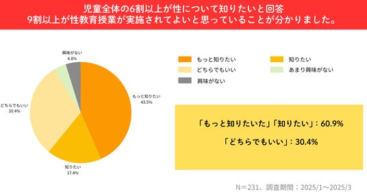 そしてアンケート結果からは、児童たちが性教育授業があることを前向きに捉えていることが分かる結果となりました。児童の6割以上が性教育について『もっと知りたい』と回答、9割以上が性教育授業が実施されることに肯定的でした。この結果は、児童たちが正しい知識を得たい、知りたいと思っていることを示すものであり、今後の性教育のあり方を考える上で非常に重要な示唆を与えてくれました。