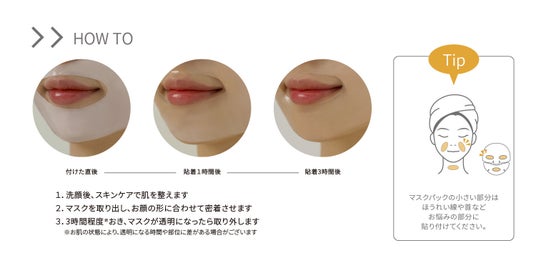 (1)3~8時間の密着*5で透明に変化長時間かけて美容液成分がぐんぐん浸透*2します。密着力と保湿力を独自の黄金バランスで実現し、横になってもズレ落ちずにピッタリ密着!
