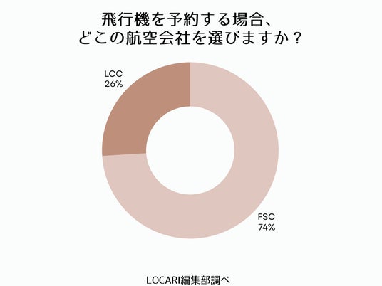 旅行で利用する航空会社については、74%がフルサービスキャリア(FSC)を選択。そのうちANAが41.3%、JALが32.7%と、日系大手2社が圧倒的な支持を集めました。一方で、26%の人はLCCを選んでいます。(n=104)