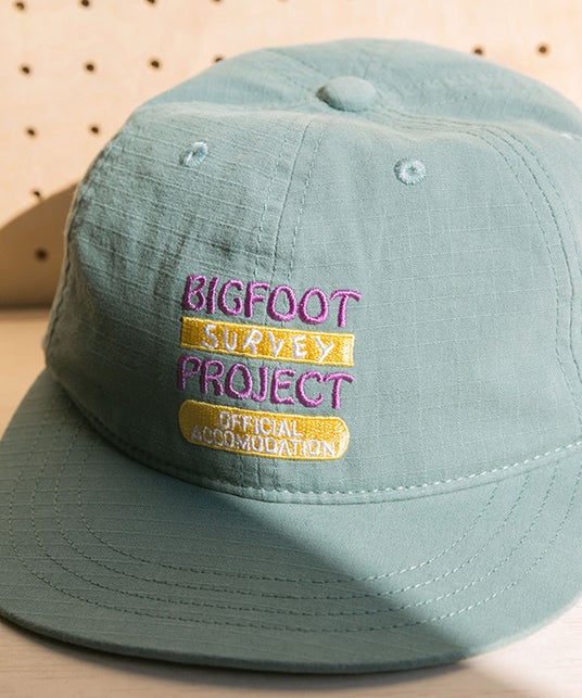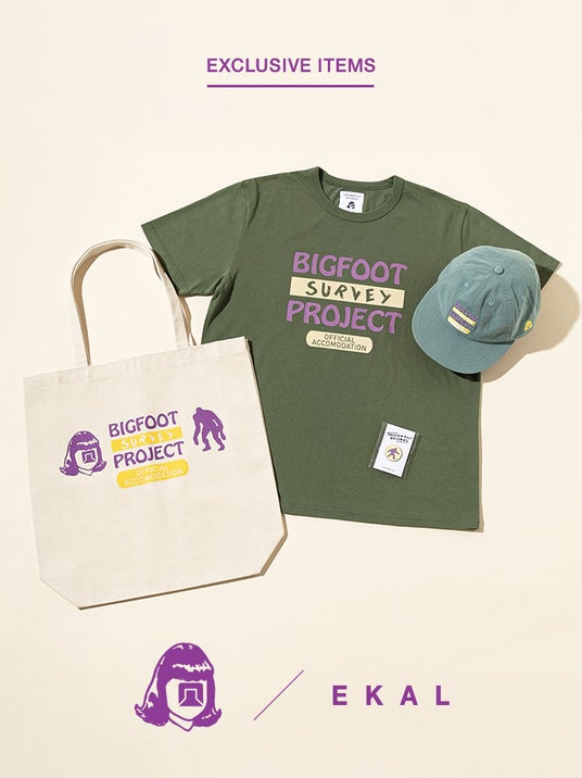 今回の企画として、EKALのブランドとアウトドアの親和性、そしてTINY GARDEN 蓼科の施設をイメージしたアートワークを提案していただき、おなじみの「BIGFOOT SURVEY PROJECT」をデザインした、Tシャツ、キャップ、トートバッグ、ピンバッジ(随時販売予定)の4アイテムのラインナップ。