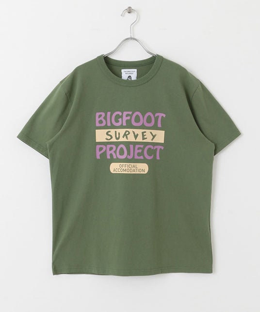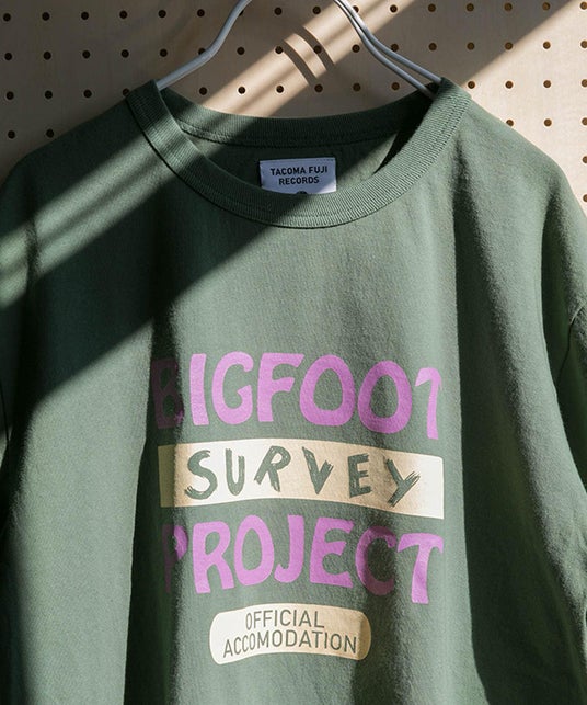 デザインはTACOMA FUJI RECORDSオリジナルのTシャツをカラー別注。「BIGFOOT SURVEY PROJECT」のロゴをプリント。ボディもタコマフジオリジナルで展開しているコットン100%のものを使用しています。