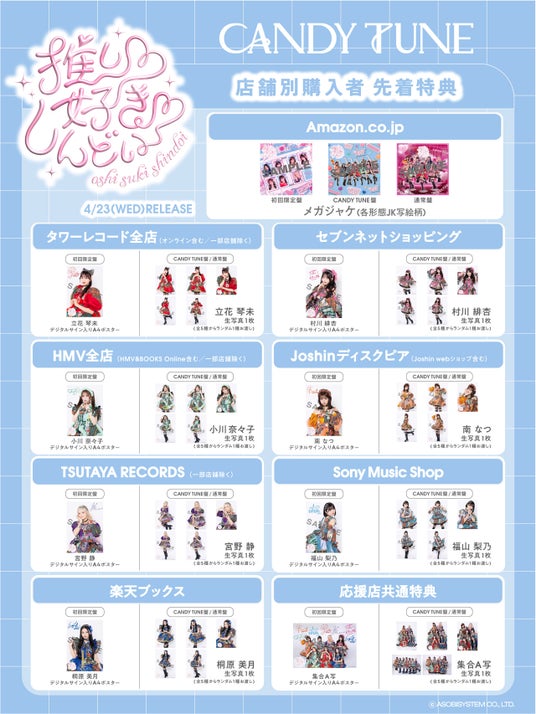 先月公開された「倍倍FIGHT!」がミュージックビデオ480万回再生、TikTokは音楽チャートの人気曲ランキングで6週連続1位を獲得し総再生回数50億回を突破するなど、注目を集めているCANDY TUNE。4月23日(水)に発売される2ndシングルCD『推し(ハート)好き(ハート)しんどい』より、新曲「絶対きゃんちゅー宣言っ!」が4月4日(金)に先行配信。さらに、CDの店舗別購入者特典が公開された。