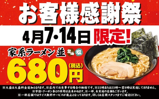 ~2025年4月7日(月)・14日(月)※限定で『家系ラーメン並』を税込680円で提供~