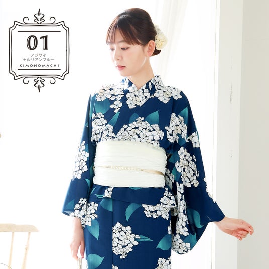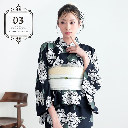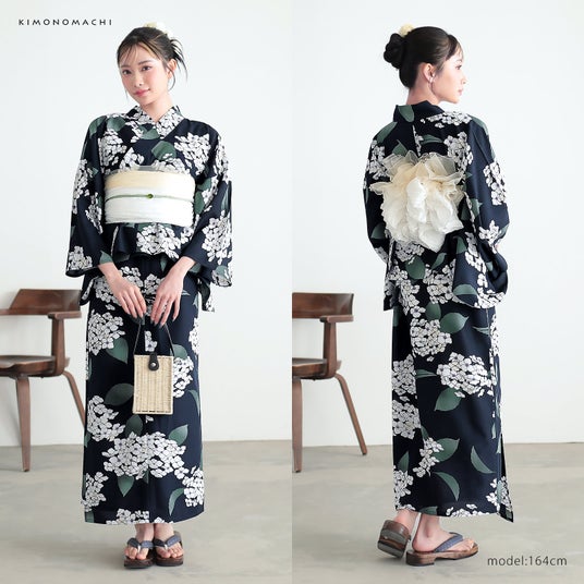 浴衣:濃紺の地にオフホワイトと淡いベージュのアジサイの花、グレイッシュな深緑のぼかしの葉。花びらの淡い紫のぼかしに蕊の深紅色が上品なアクセントとなっています。