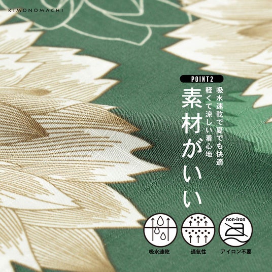 快適な高機能ポリエステル素材通常の浴衣と同じ吸水速乾ポリエステル素材を採用しました。猛暑の中でもサラッと清涼感と爽快感を感じられると好評です。自宅の洗濯機で洗うことも可能で、洗濯時にもシワになりにくく、吸水速乾だから乾きやすい!洋服と同じように気軽に取り扱える浴衣です。